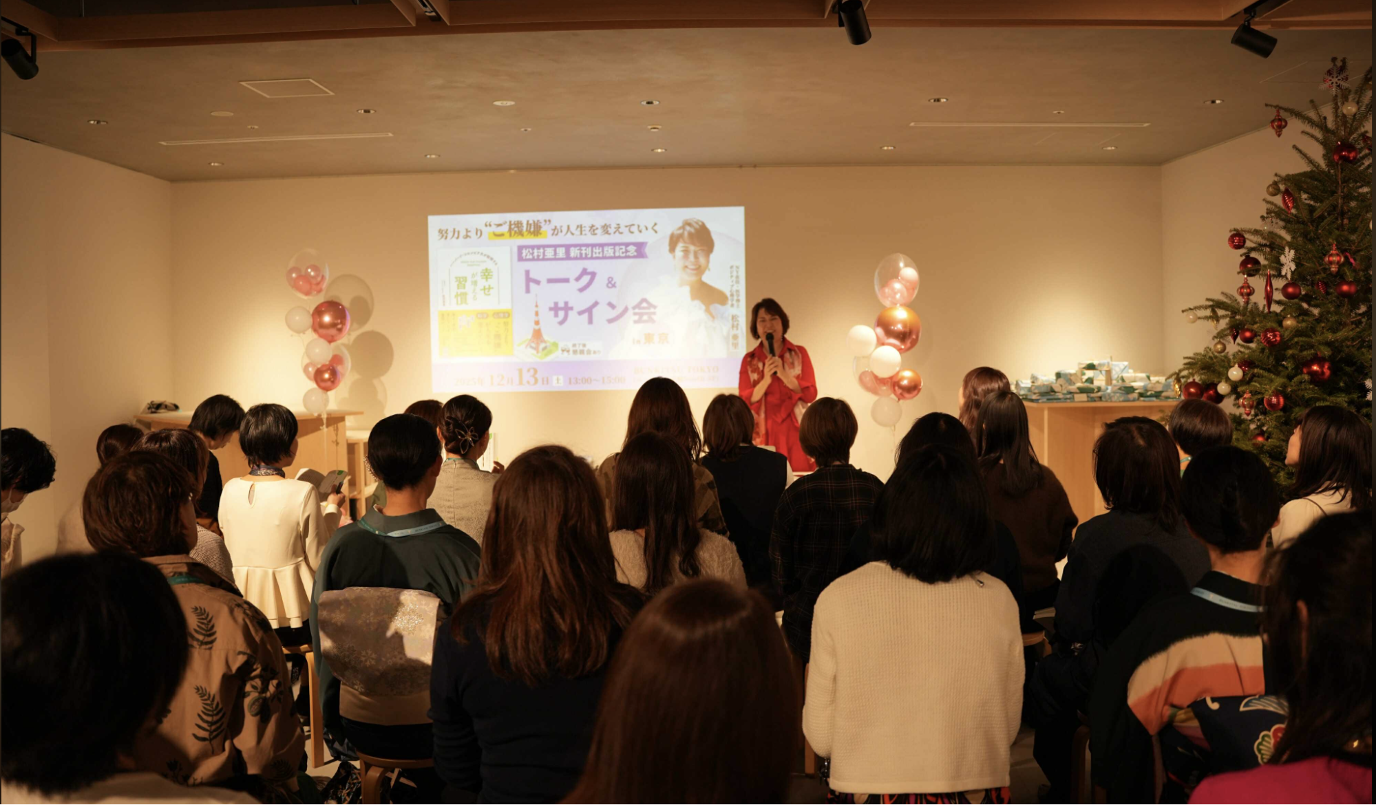 本が生まれた背景や、松村自身の体験、そして日常生活の中で無理なく取り入れられる「幸せが増える習慣」についてのお話に、参加者の皆さんは深くうなずきながら、熱心に耳を傾けていらっしゃいました。