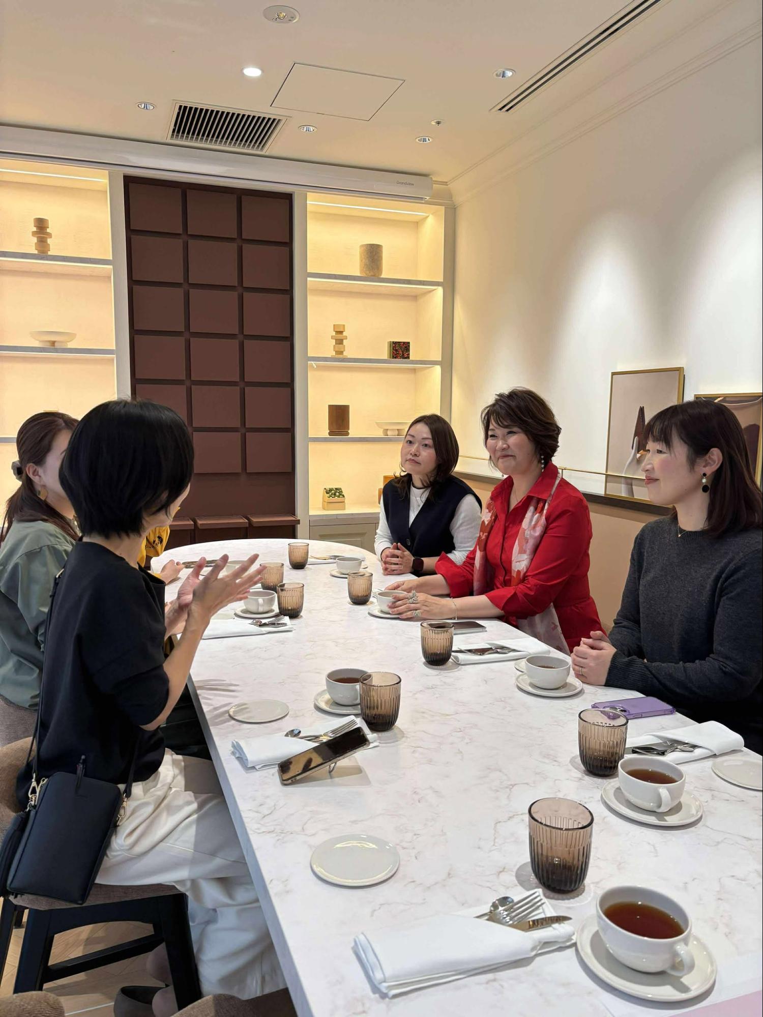 実はラ・メゾン・ドゥ・ショコラとして、広いカフェが併設されている日本での最初のお店になるそうで、チョコレートを主体とした美味しいアフタヌーンティーを囲んでの懇親会となりました。